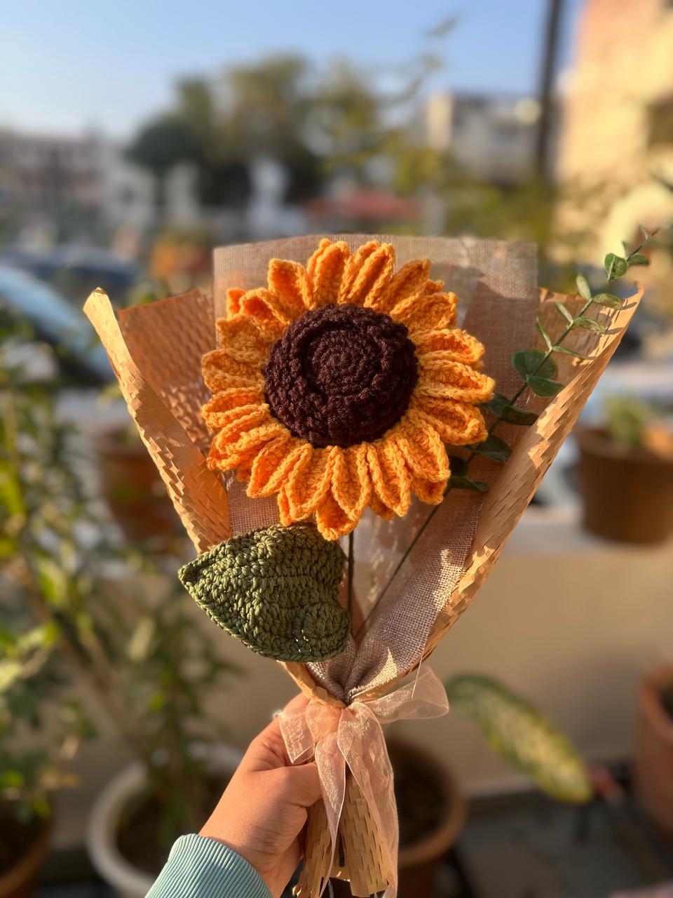 Touch of sunshine that lasts forever with our Handcrafted Crochet Double-Layered Sunflower Bouquet. Carefully crocheted with premium yarn, this bouquet features a bright yellow sunflower with a rich brown center, paired with a textured green leaf and soft faux greenery. Wrapped in eco-friendly craft paper and delicate mesh fabric, it’s tied with a sheer ribbon for a natural, rustic finish.
